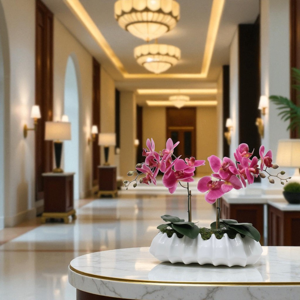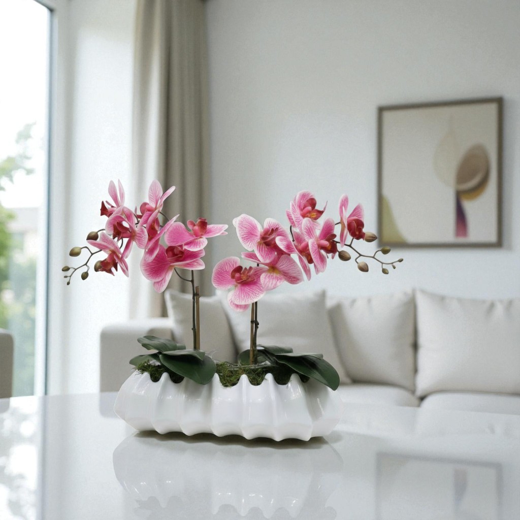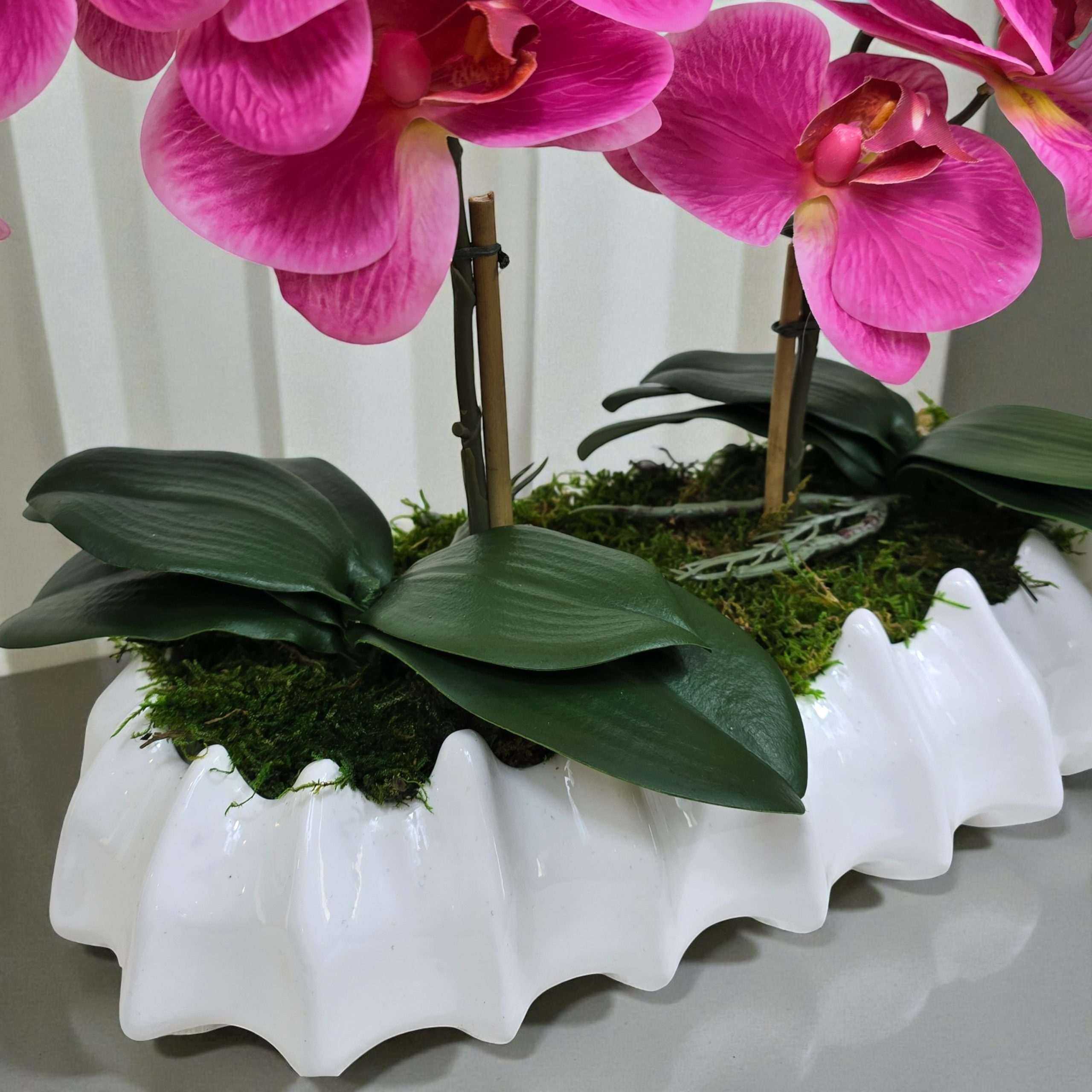 Arranjo de orquídeas em vaso de cerâmica branco Caravela