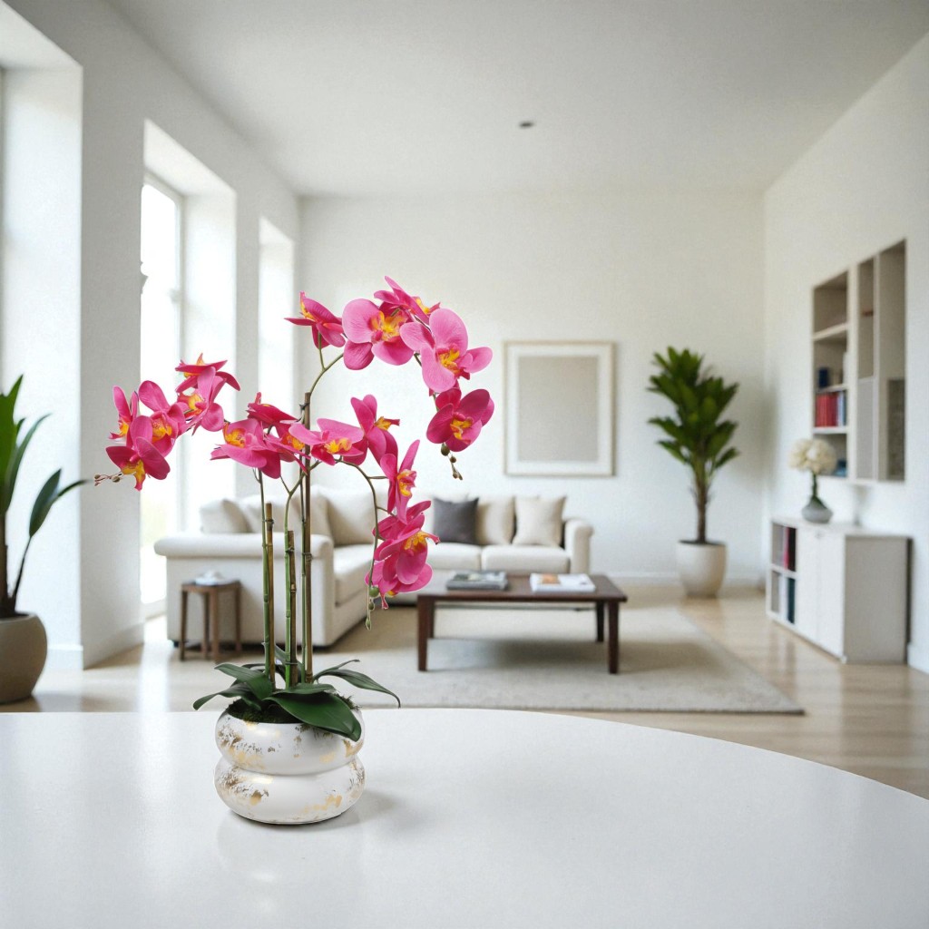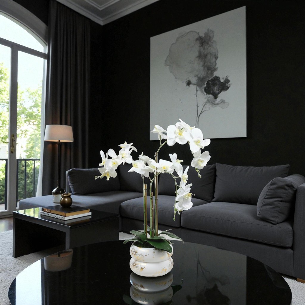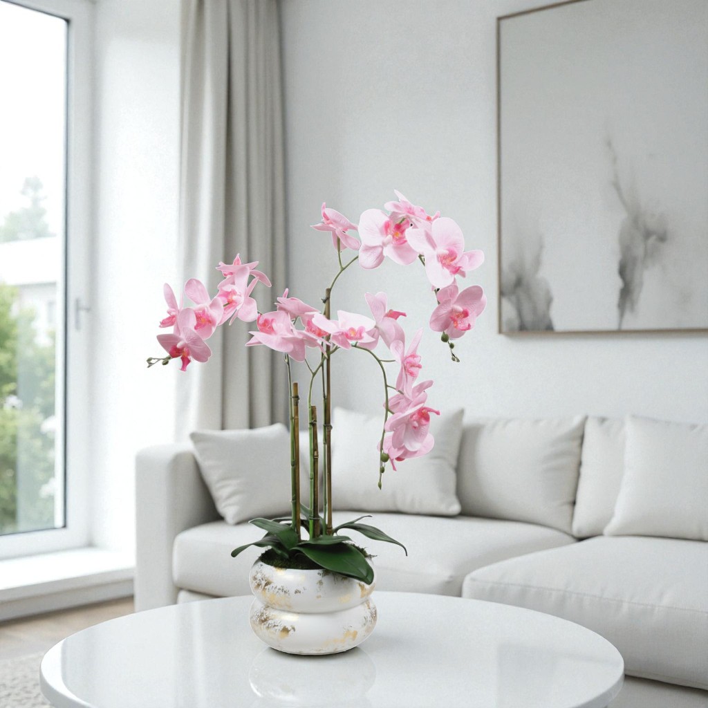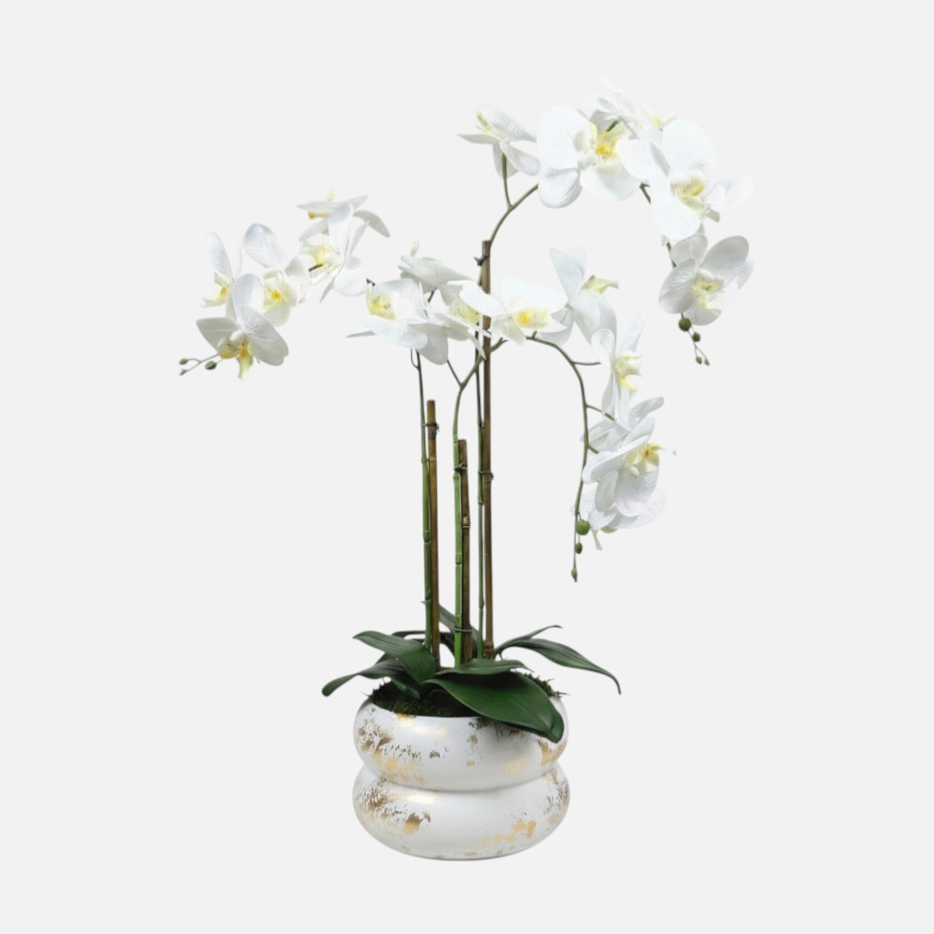 Arranjo de orquídeas em vaso de cerâmica branco e dourado Lumina