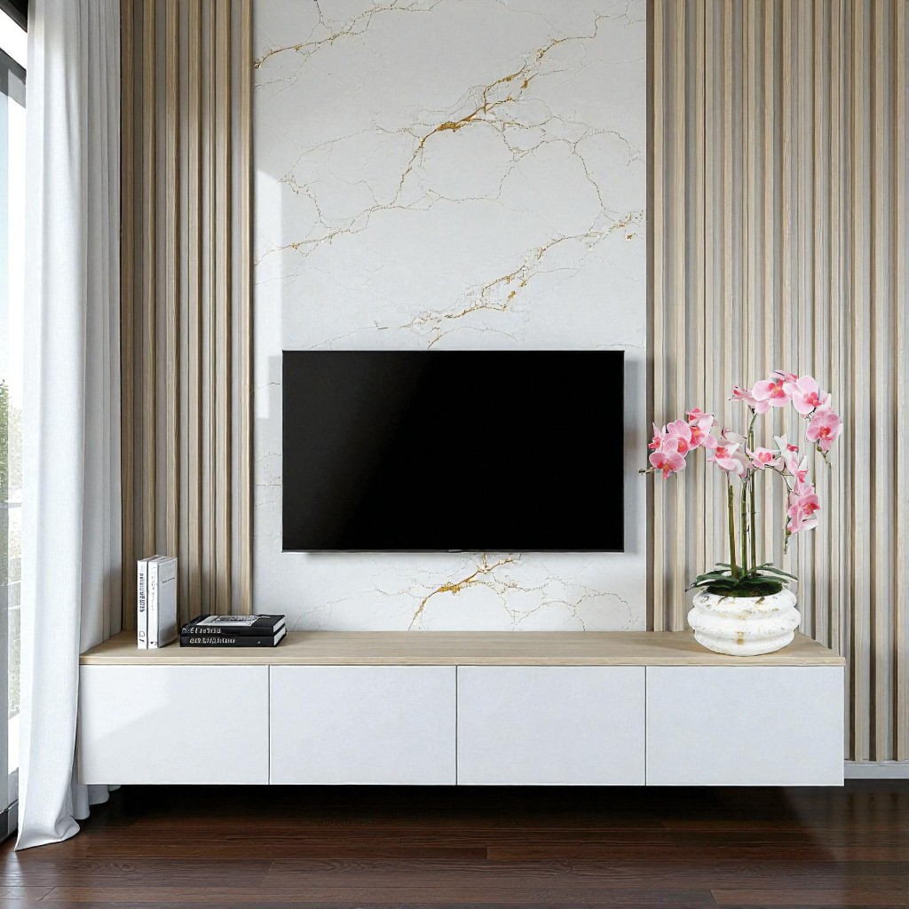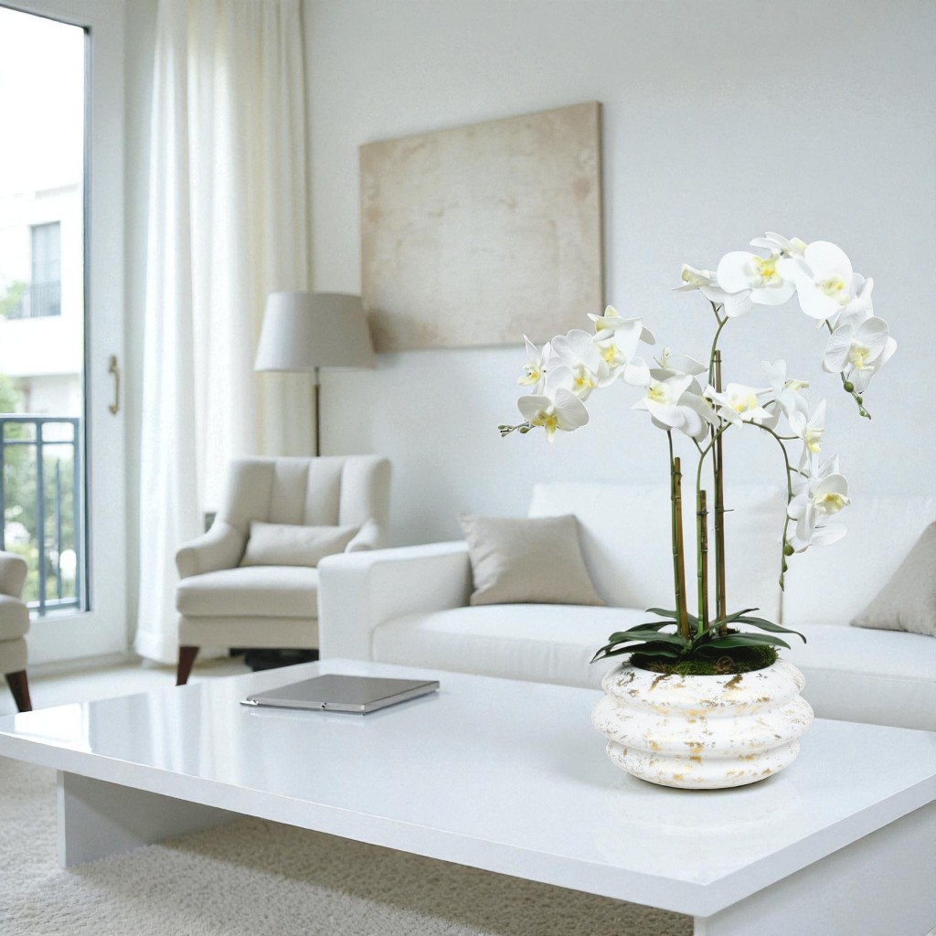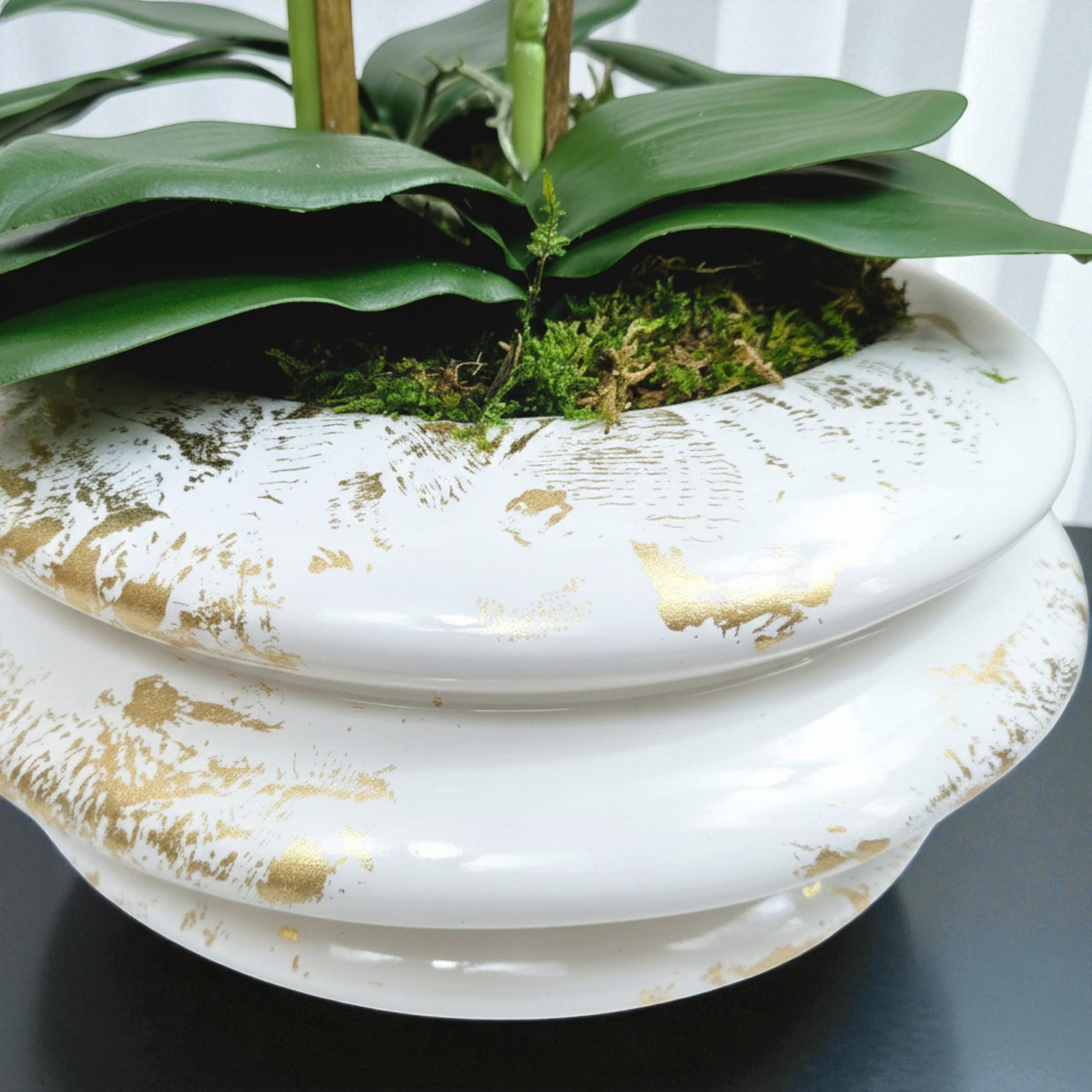 Arranjo de orquídeas em vaso de cerâmica branco e dourado Solene