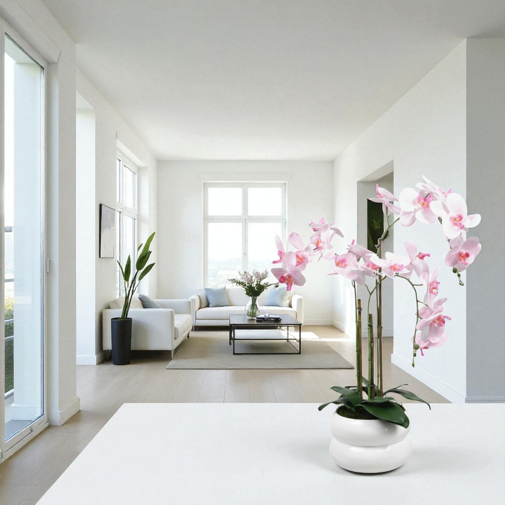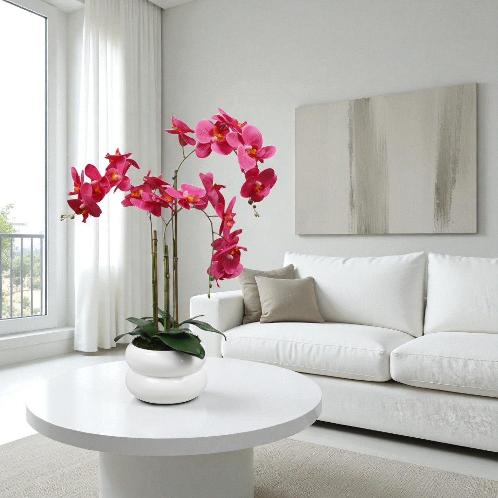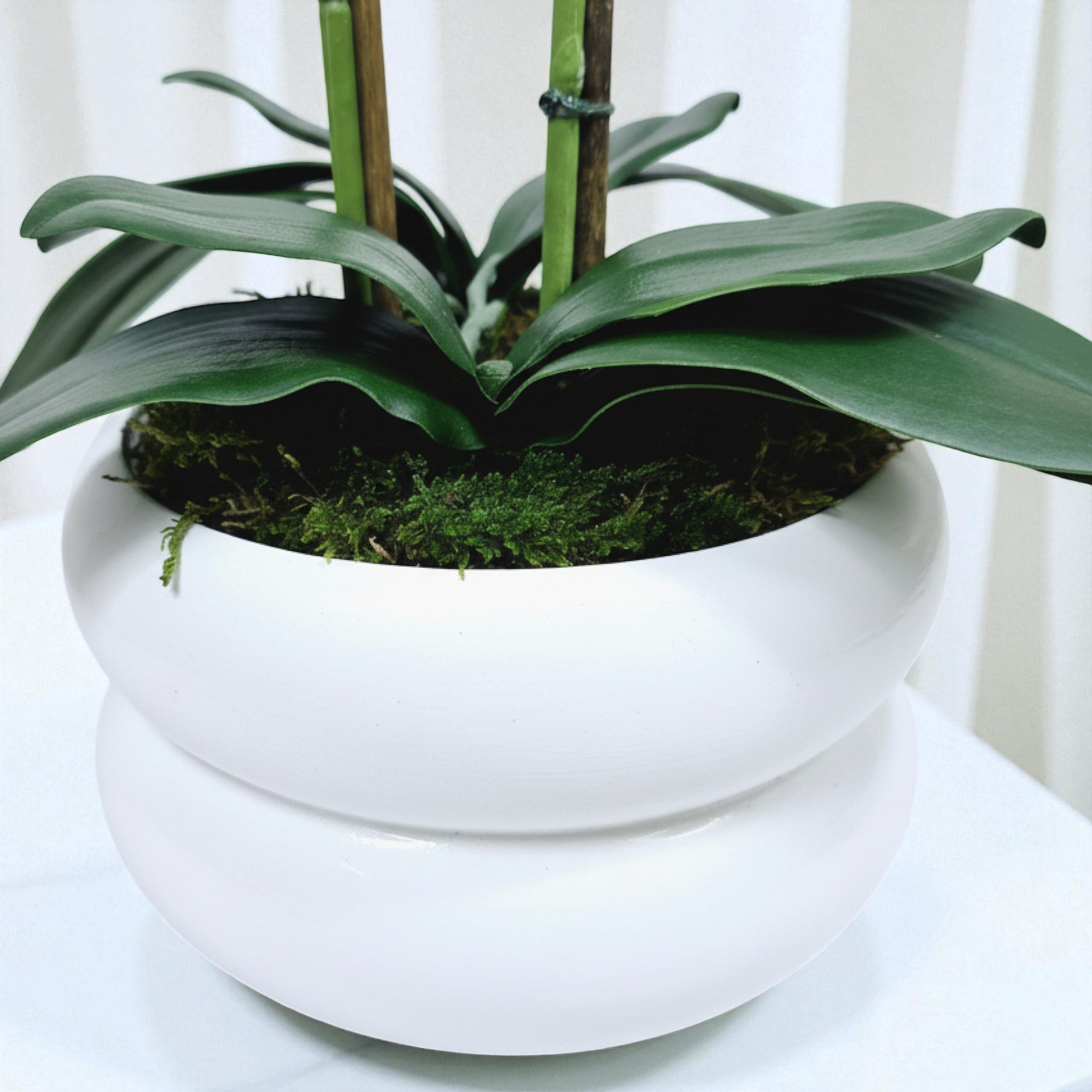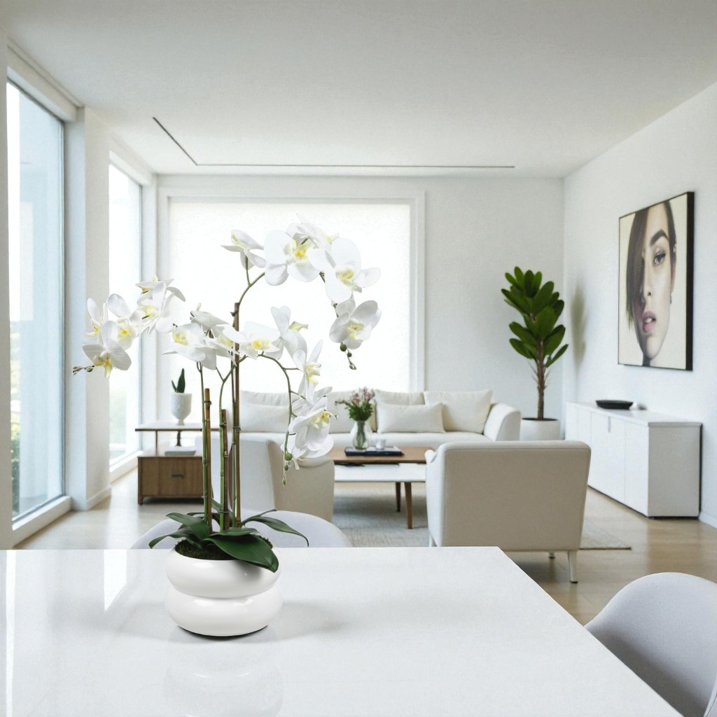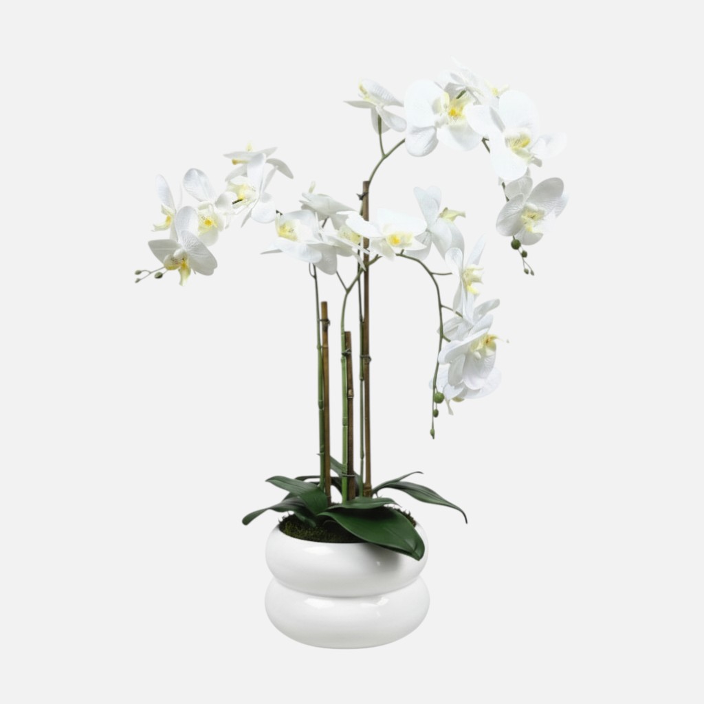 Arranjo de orquídeas em vaso de cerâmica branco Lumina