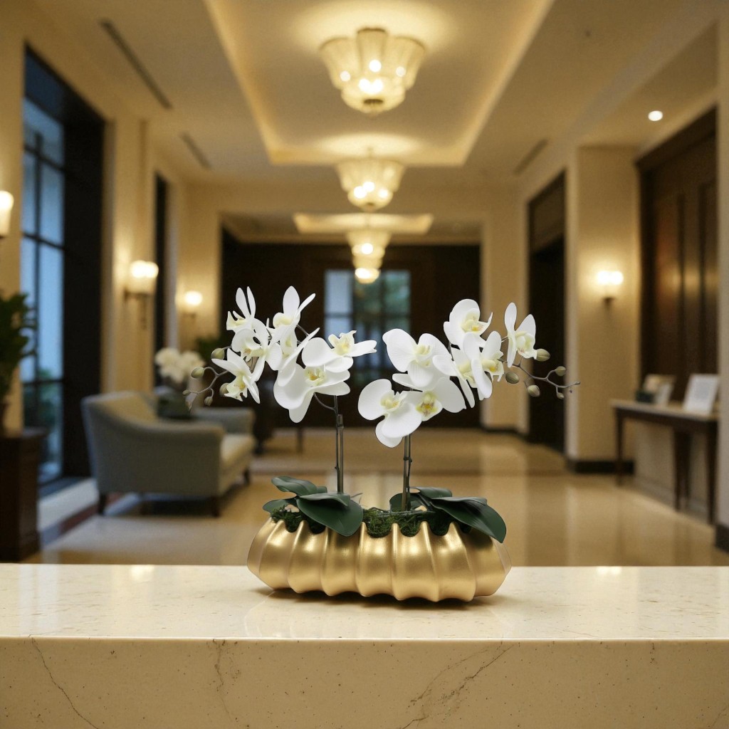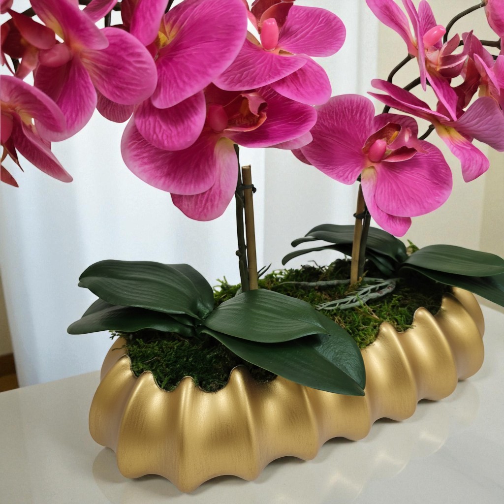 Arranjo de orquídeas em vaso de cerâmica dourado Caravela