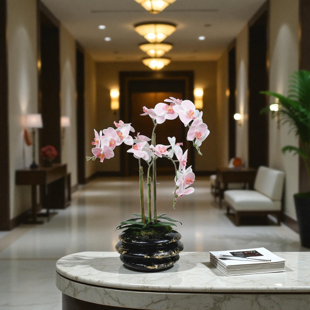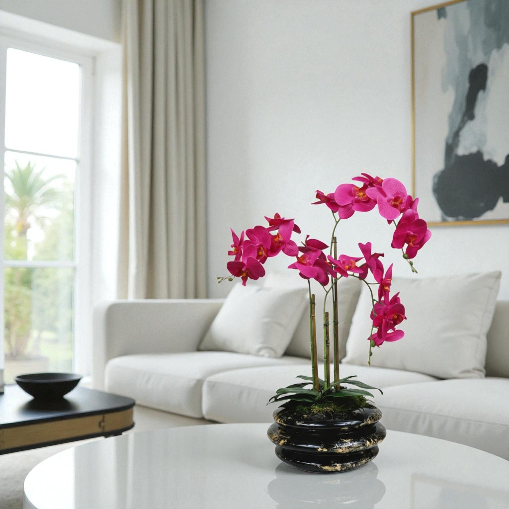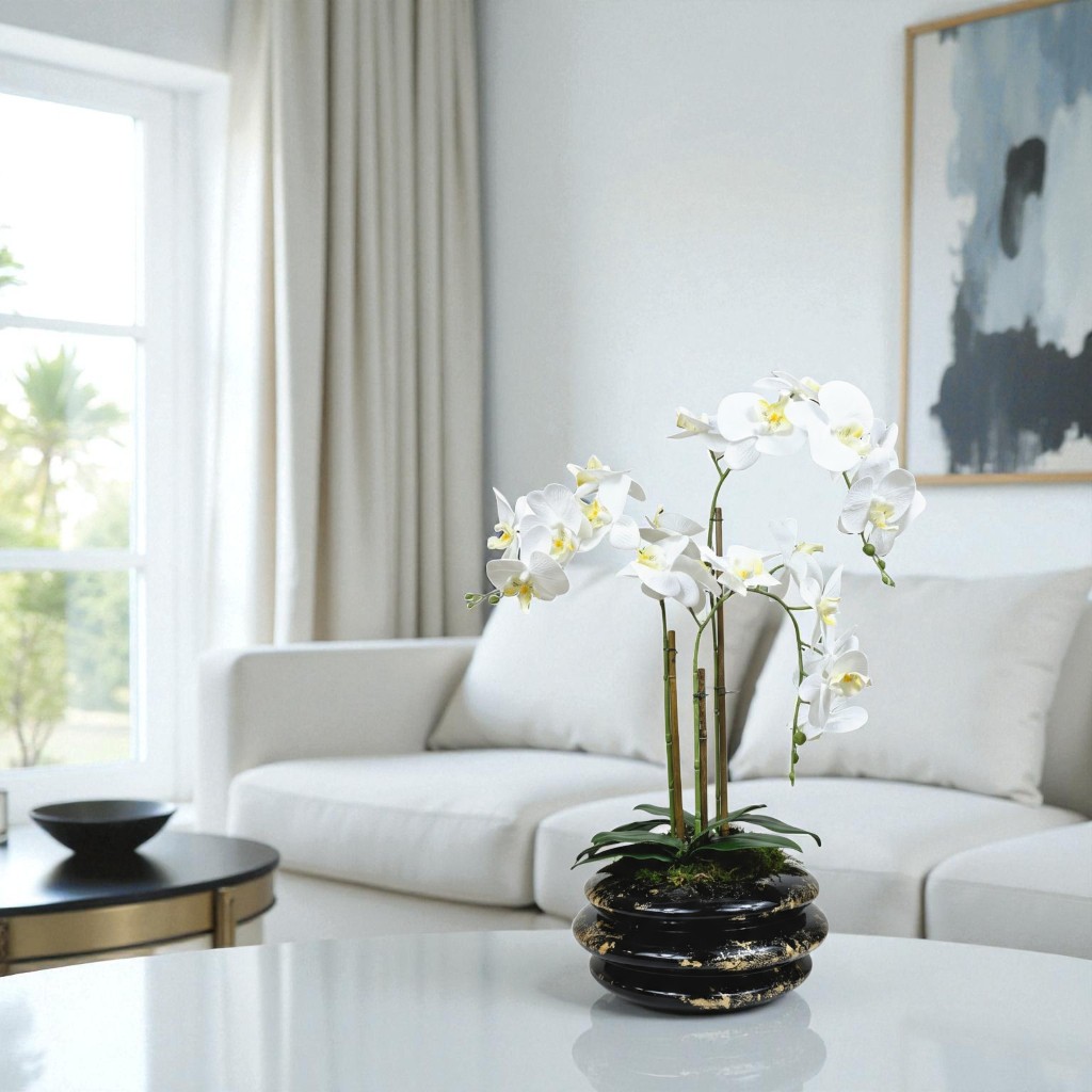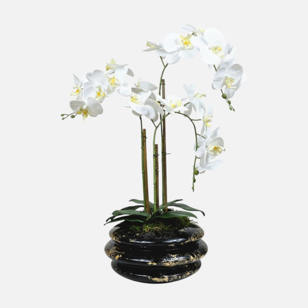 Arranjo de orquídeas em vaso de cerâmica perto e dourado Solene