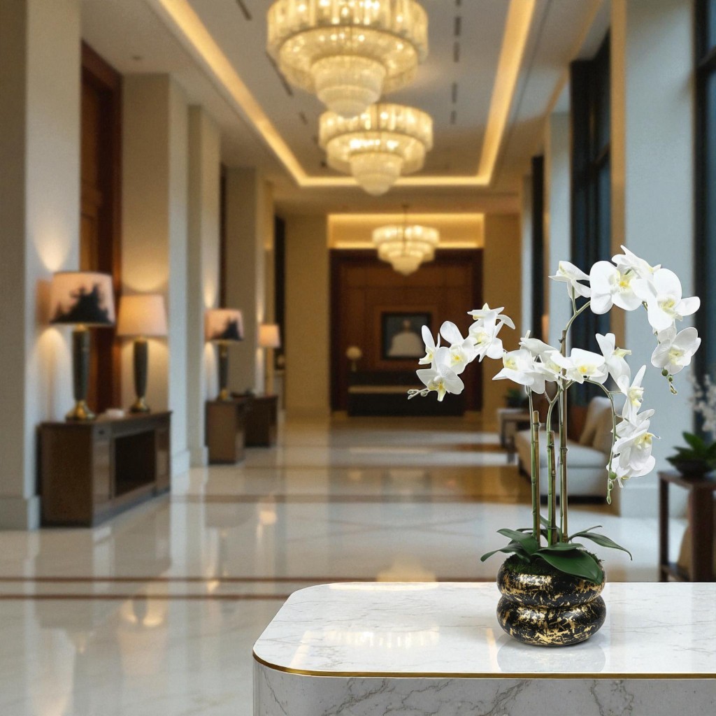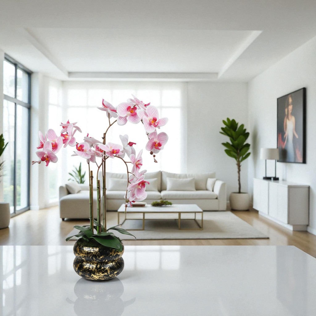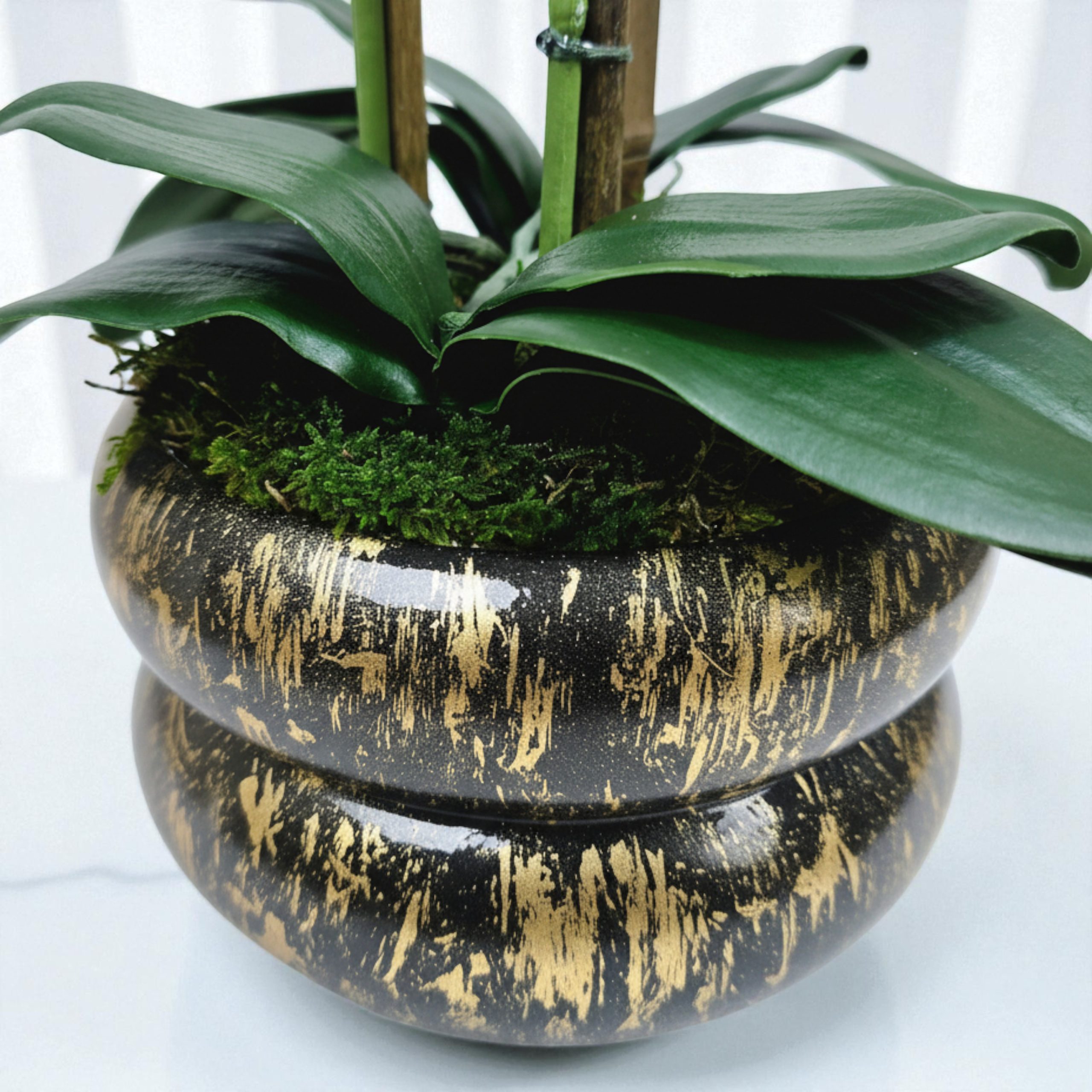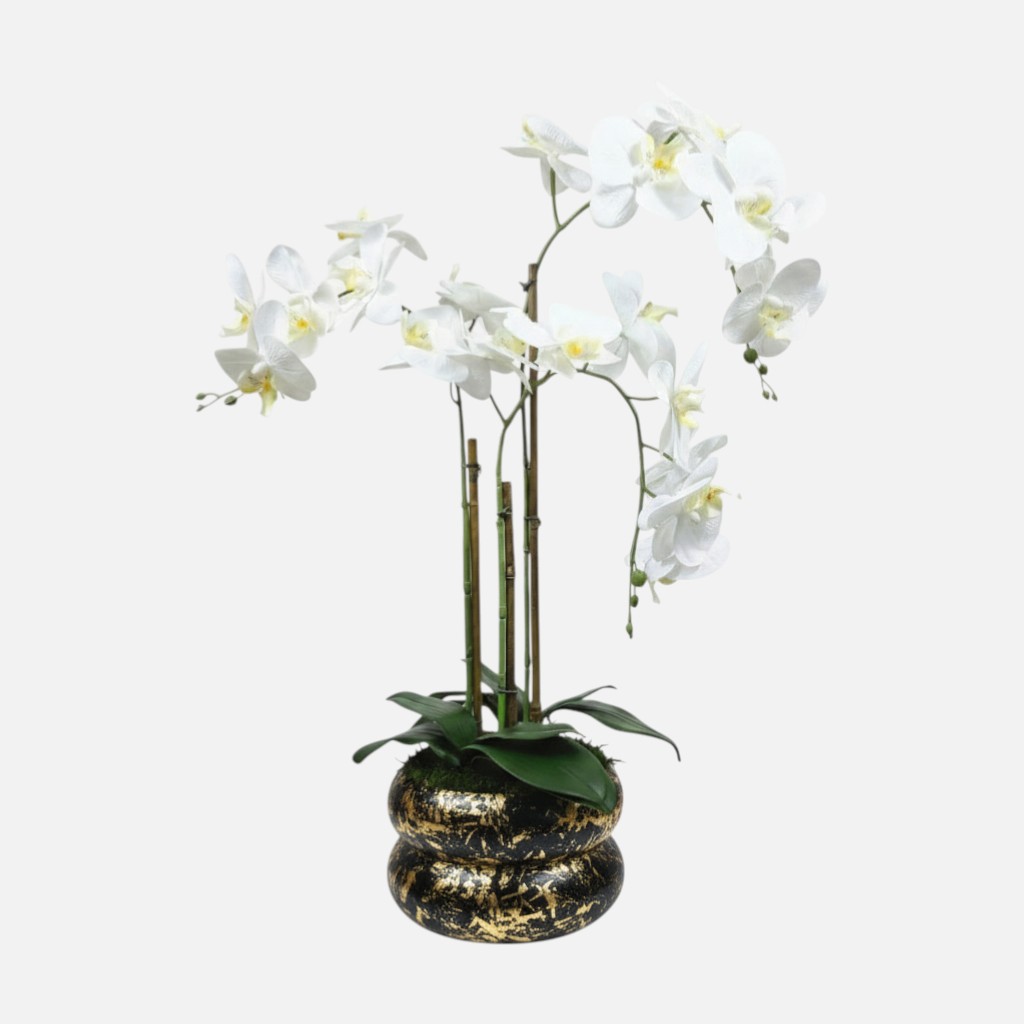 Arranjo de orquídeas em vaso de cerâmica preto e dourado Lumina